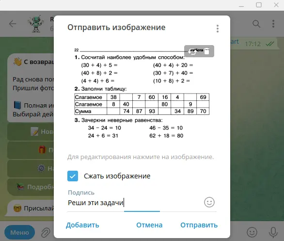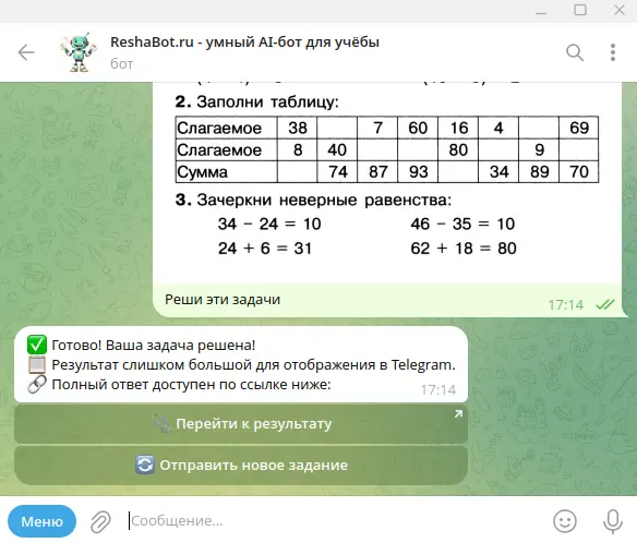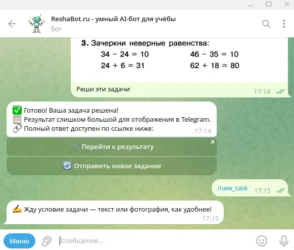 Открыть ReshaBotСделайте фото или отправьте текст — ReshaBot распознаёт условие, находит ключевые данные и автоматически определяет тип задачи.